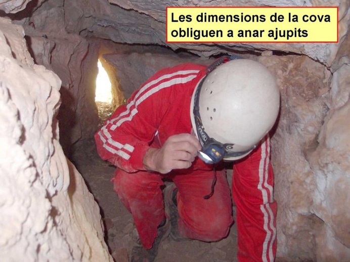 La cova està formada per tres boques, una a tocar de l'altra. La boca principal és estreta, te forma d'arc gòtic de 60 cm d'alçada per 30 cm d'amplada. Dóna pas a la cambra principal, d'uns 4 metres de llarg per una amplada de l'ordre d'un metre i una alçada mitjana de 1,2 m, lloc on s'han trobat les restes arqueològiques (cova sepulcral?). A la paret esquerra de la cambra hi ha una mena de bloc desprès que deixa a la seva part superior una esquerda horitzontal impenetrable que comunica amb la galeria de la segona boca de la cavitat. El total de la cova assoleix els 10 m de recorregut